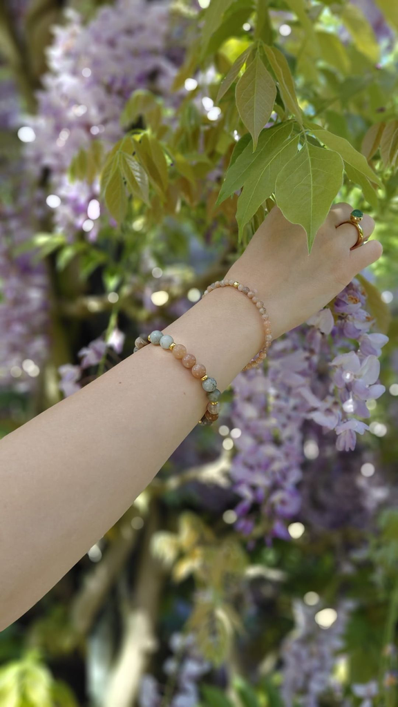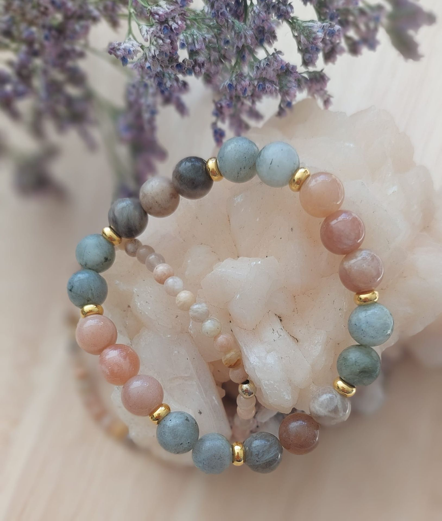 Zonnesteen, Maansteen en Labradoriet vormen een krachtige combinatie die balans brengt tussen licht, intuïtie en transformatie. Samen zorgen ze voor zowel positieve energie, zelfvertrouwen, innerlijke wijsheid en bescherming. Met deze armband kan je weer helemaal in je vrouwelijke kracht staan.